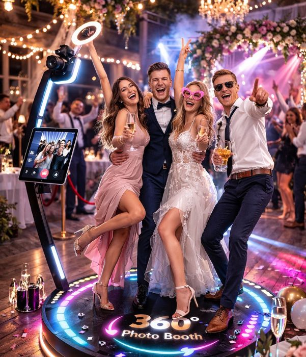 Forgó kamerás, slow motion felvétel, amely látványos, dinamikus videót készít a vendégekről.